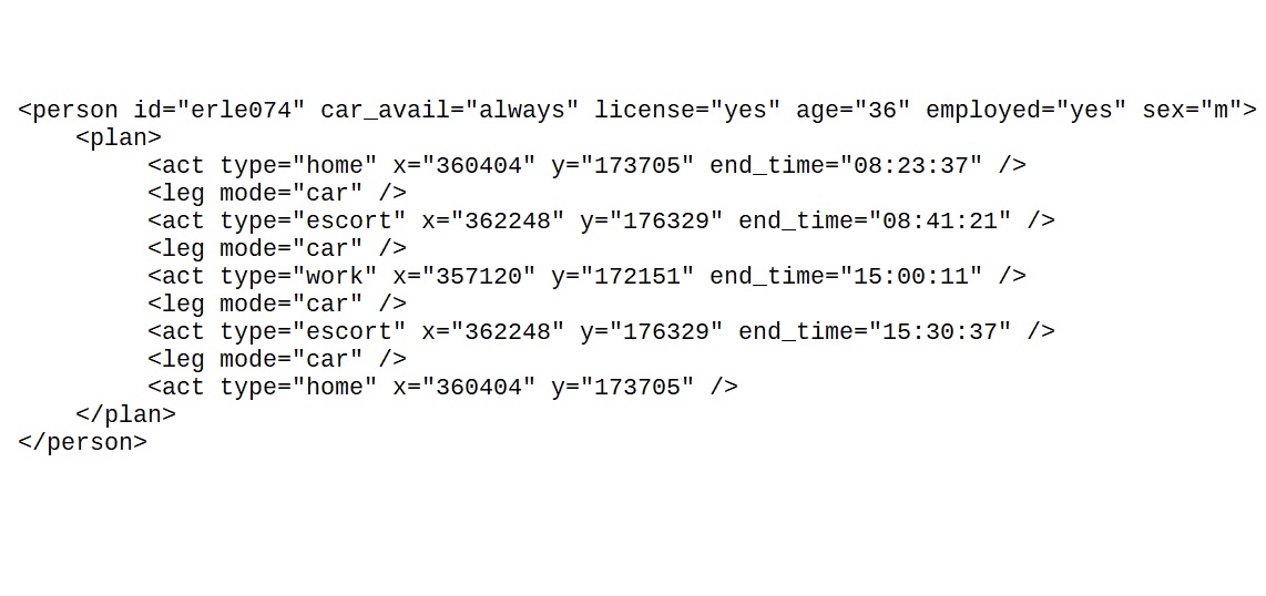 The agent plan above includes an "escort" activity to simulate a 'school run' responsibility for this agent.
